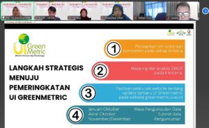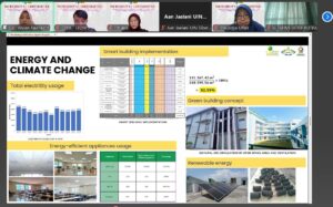 Dalam pemaparan materi, narasumber menjelaskan bahwa UI GreenMetric merupakan pemeringkatan universitas dunia berbasis keberlanjutan yang disusun untuk menilai kebijakan dan program hijau di kampus-kampus global. Enam kriteria yang menjadi penilaian utama meliputi: Setting and Infrastructure (15%), Energy and Climate Change (21%), Waste (18%), Water (10%), Transportation (18%), dan Education and Research (18%).